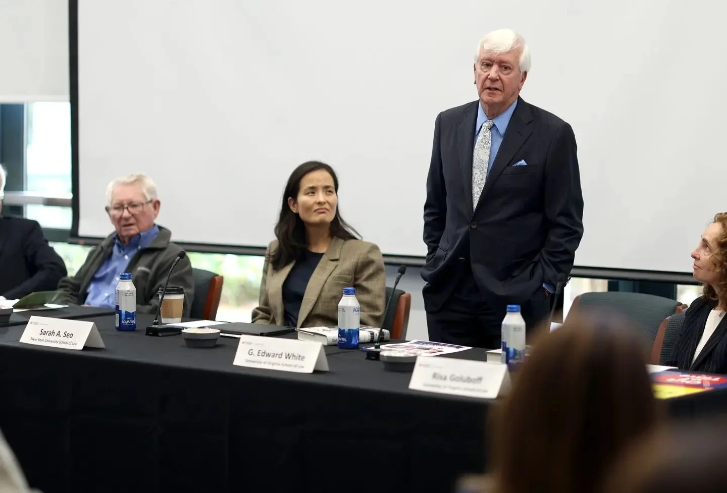 Professor White responded to each of the panelists. Responding to Professor Seo, he said that he “wouldn’t put it past Jackson” to bolster his image. To Professor Powe, he stated that he was more supportive of Justice Jackson. He argued that Nuremberg led Justice Jackson to become a great advocate of civil liberties and the First Amendment and suggested he understandably struggled to find legal arguments to end segregation. To Professor Davies, he said that Justice Jackson claimed to have chosen Saint Albans for its religious character and said that if he was angling for a government position, there were easier ways to do so.